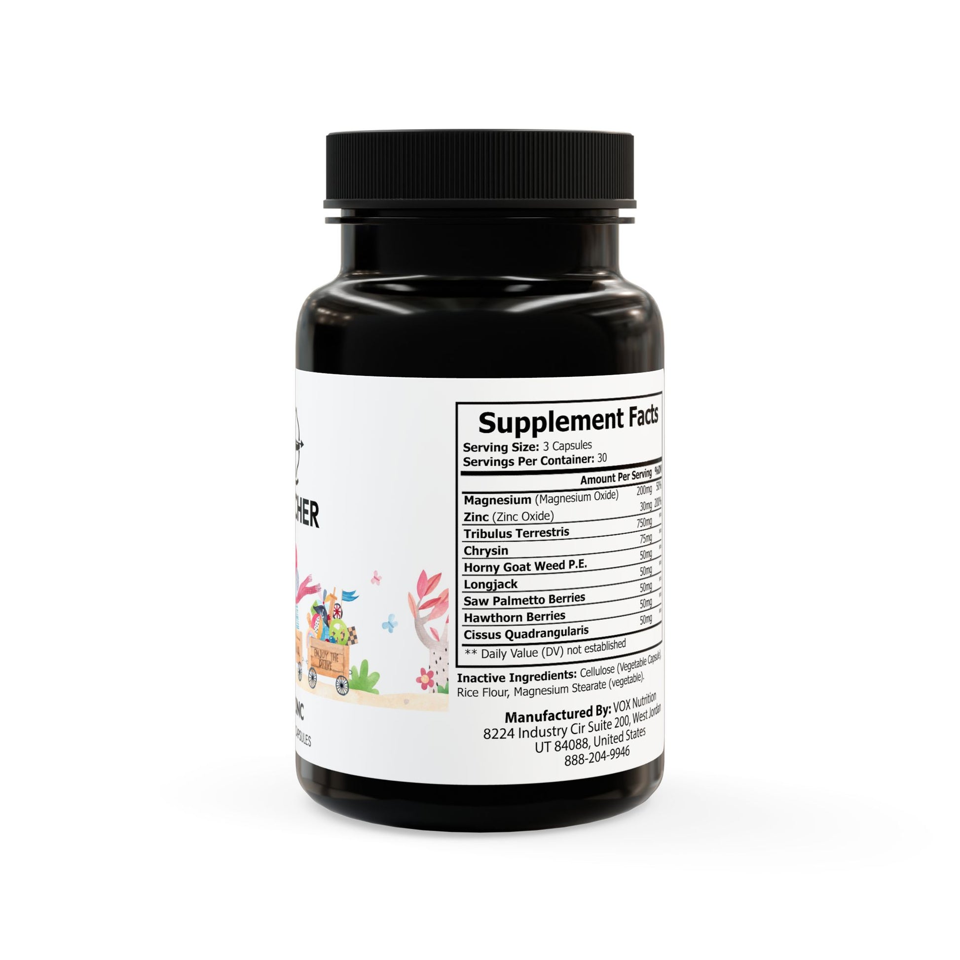 Ingredients: Magnesium (Magnesium Oxide), Zinc (Zinc Oxide), Tribulus Terrestris, Chrysin, Horny Goat Weed P.E., Longjack, Saw Palmetto Berries, Hawthorn Berries, Cissus Quadrangularis. Inactive Ingredients: Cellulose (Vegetable Capsule), Rice Flour, Magnesium Stearate (vegetable).